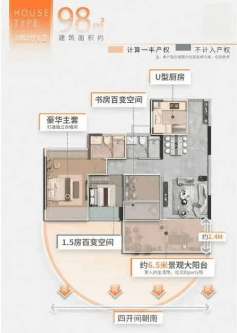 6.5米景观大阳台,最小进深达2.4米,视野开阔;