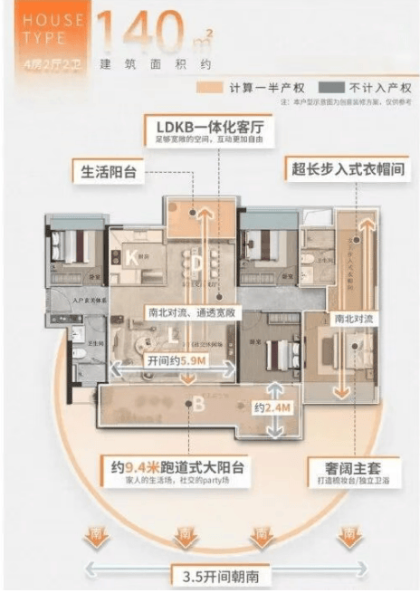 约9.4米跑道式大阳台,可容纳家庭聚会、烧烤、棋牌等多元场景;