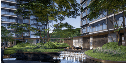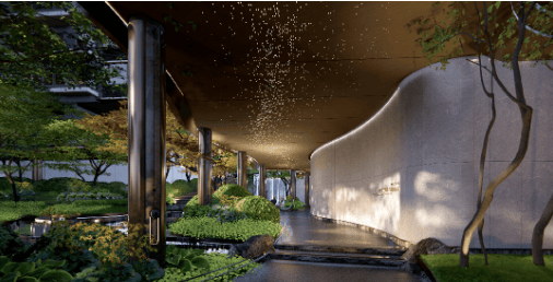 社区内部打造约1.8万㎡下沉式双层园林,结合高差近5米的“半天云瀑”水景,营造“庭院式立体山水园林”,归家动线层次丰富,兼具观赏性与功能性。