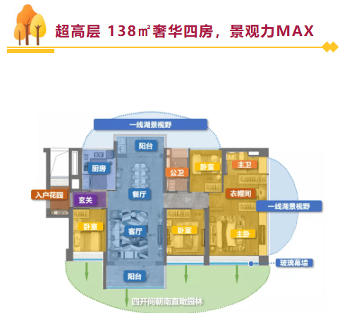 在售户型方面,项目主打三大明星产品:95平方米全能三房、125平方米卓越四房及138平方米奢华四房。95㎡户型以高性价比著称,专梯入户、南北双阳台、纯南布局、1:1楼间距,兼顾实用性与舒适度;125㎡四房采用LDKG一体化布局,约6.8米宽景阳台极大拓展视野与互动空间,私梯入户提升归家仪式感;138㎡超高层四房则以窗地比约27%、四面朝南、方正灵动格局为核心优势,最大化引入自然光线与湖山景观,实现景观力与功能性的双重巅峰。