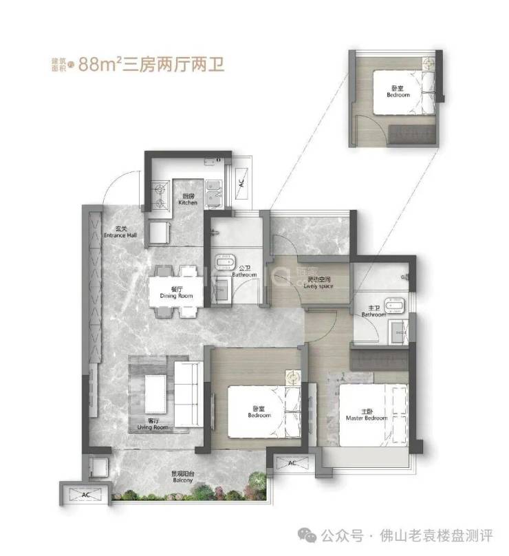 主力户型二:建面约88㎡三房两厅两卫
