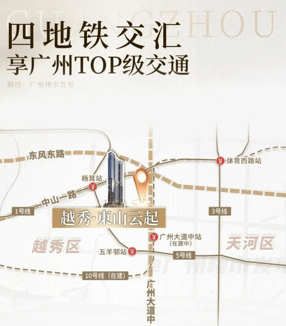 项目坐落于中山一立交西侧,地处越秀区东部核心,北接老东山文化腹地,南望珠江新城CBD,真正实现“一脚踏两区”。步行约700米可达地铁5号线杨箕站,约800米覆盖五羊邨站(5号线)与体育西路站(1/3号线),未来还将新增地铁10号线广州大道中站,距离仅约400-500米,预计今年通车后将进一步提升出行效率。