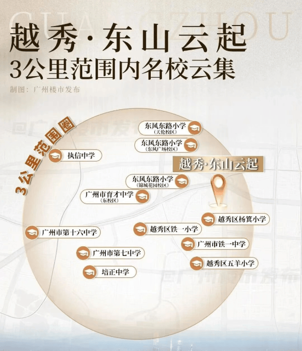 教育是東山云起最突出的附加值。项目对口杨箕小学,该校已纳入广铁一中教育集团统一管理。根据2024年越秀区小升初分组政策,初中可直升广州七中、十三中、十六中、培正中学、省实中学、铁一中学等名校集群,堪称“豪华教育阵容”,基本覆盖12年优质教育路径(具体入学政策以当年教育局公布为准)。