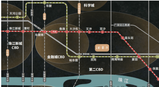 其中,中建岭南序步行至13号线南海神庙站约800米,该线路一期已通车,二期即将通车,乘坐地铁30分钟即可直达珠金琶CBD,轻松实现与核心商务区的快速连通。项目所在的海丝城板块共有七个组团,部分组团靠近5号线,其中中建海丝城一期靠近5号线双沙B出口仅50米,乘坐5号线无需换乘即可直达金融城、珠江新城。