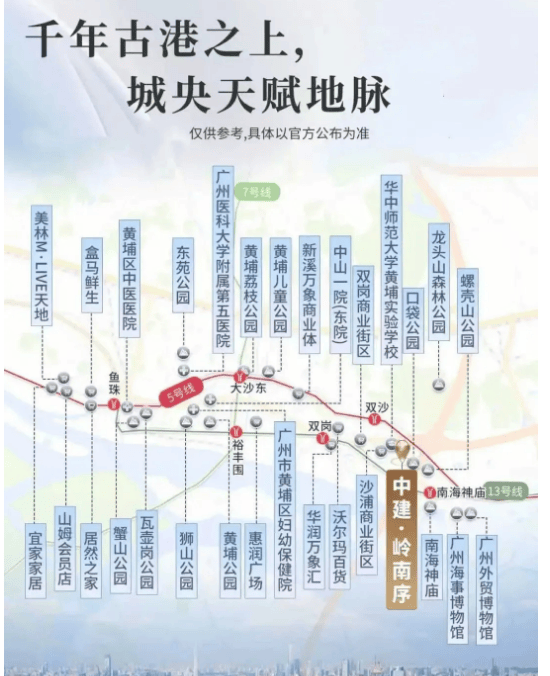 中建岭南序坐落于黄埔大桥旁,位于华中师范大学黄埔实验学校、黄埔区中医医院以南,地处海丝城核心板块,地理位置优越。项目最大的交通优势在于双地铁加持,横跨5号线与13号线两大交通干线。