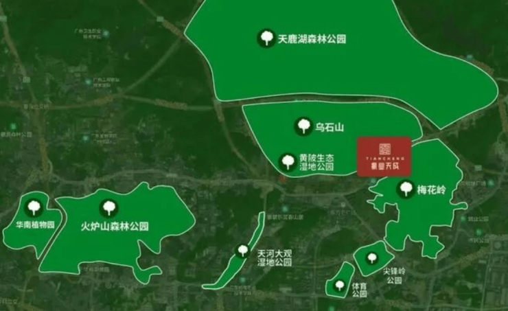自然景观:项目北靠乌石山、南望梅花岭,临近天鹿湖森林公园。周边还有天河湿地公园等 6 大公园环绕。
