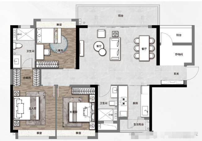 125㎡则主打横厅四房,客餐厅一体化布局,南北双阳台对流,超6米景观阳台直面大夫山湖景,视觉通透感极强。