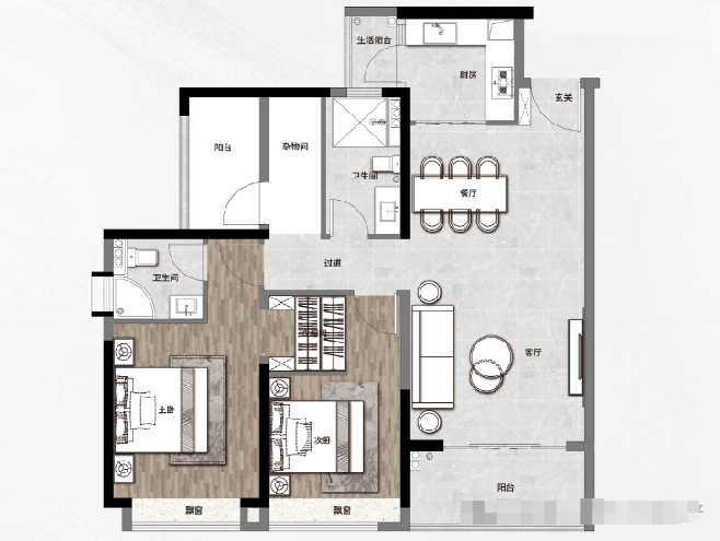 105㎡户型为板块内罕见的纯南向三开间朝南设计,约3.9米大开间客厅搭配双阳台,兼顾采光与景观视野;