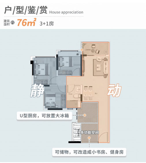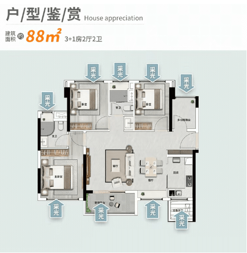 户型设计合理:同等面积下可多享一间房,空间利用率高。