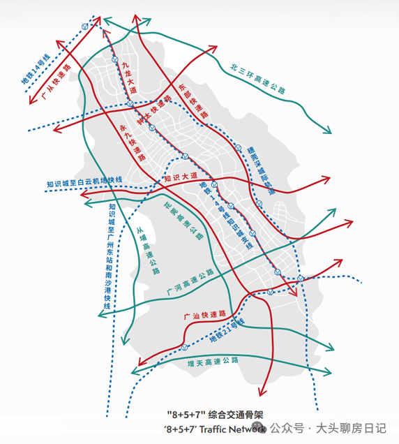 龙狮·璟珑府拥有完善的多维立体交通路网,依托知识城“8条轨道、5条高速、7条快速路”的交通规划,实现快速通达全城、链接湾区。项目紧邻花莞高速,无缝接驳城市核心干道,驾车约30分钟即可直达珠江新城,快速通达天河、越秀等核心城区,满足业主日常通勤需求。轨道方面,周边环绕地铁14号线、地铁14号线知识城支线、地铁21号线,同时规划有新白广城际线、白云机场联络线、37号线、广中珠澳线、广河高铁及有轨电车5号线,其中新白广城际线正在建设中,建成后将进一步提升轨道通勤效率,实现与广州各大城区、珠三角城市的快速联通。高速方面,广河高速、北三环高速、从埔高速、增天高速环绕周边,可快速通达珠三角各大城市。快速路方面,永九快速路、九佛快速路、智慧大道等7条城市快速路,进一步完善区域交通网络,打造湾区1小时生活圈,让业主的出行更加便捷高效。