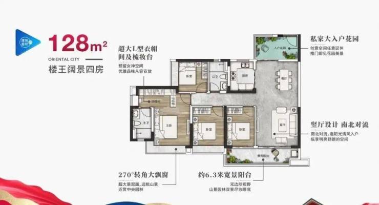 建面约128㎡四房两卫:南北通透设计,主卧配置独立衣帽间,空间开阔舒适,全明户型,通风采光俱佳,实测使用率94%-97%,适合追求高品质生活的改善型家庭。