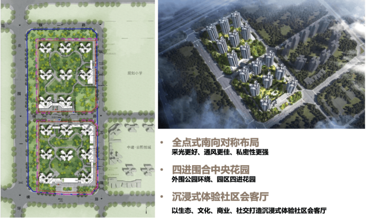 ①纯点式建筑布局:楼栋错落分布,约50米的楼间距,提高居住的私密性