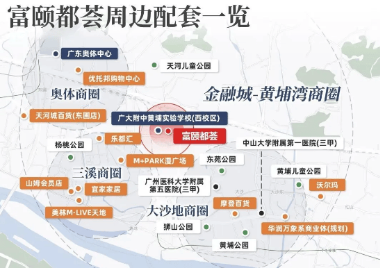 在生活配套上,富力南驰・富颐都荟实现了 “社区内自给自足,社区外配套丰富”。项目自身配建约 50 万㎡商业配套(含 26 万㎡大型商业综合体),总体量超天河城 3 倍,未来将引入购物中心、酒店等业态,目前 R 区旁的社区商业已开始运营,满足业主日常购物需求;周边 8 大商业广场环绕,包括优托邦购物中心(奥体中心店)、天河城百货(东圃店)、美林 M・LIVE 天地、山姆会员店等,进一步丰富消费选择。