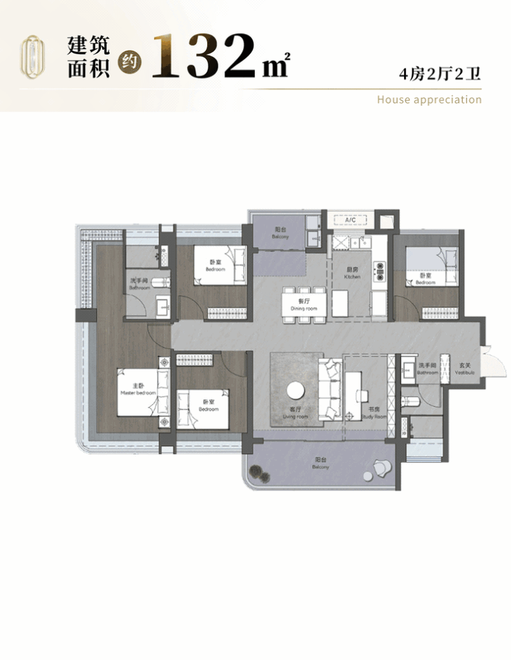131-132㎡四房:全南向布局,部分户型可眺望金山湖景,采光通风极佳,空间开阔,适合改善家庭。