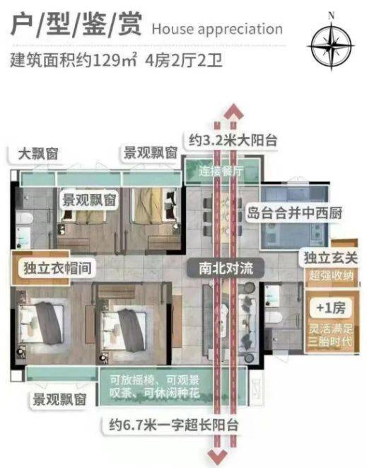 133㎡四房两厅两卫:经典竖厅布局,客餐厅一体连接6米大阳台,采光通风俱佳;主卧套房带独立卫浴,私密性强;四房格局满足二胎或老人同住需求。