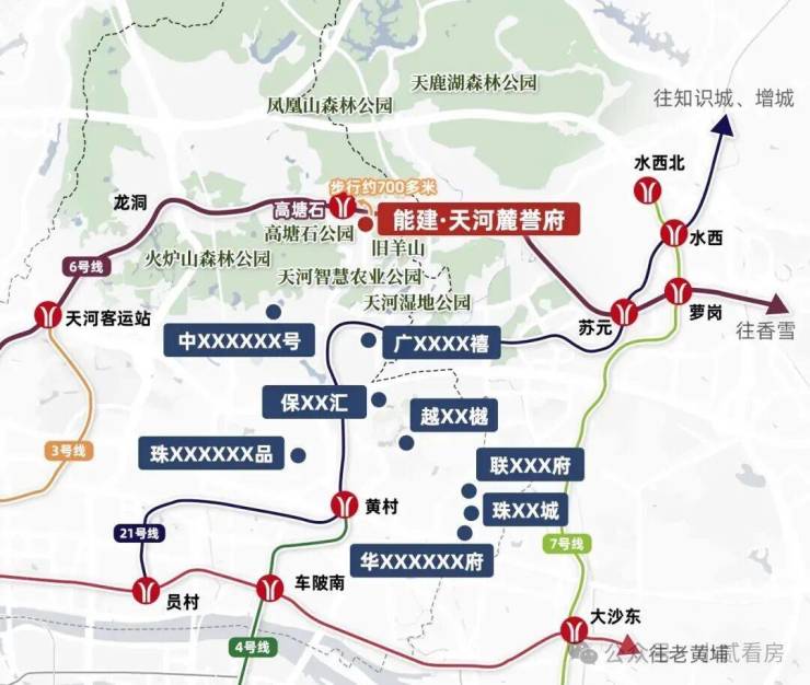 项目的交通优势极为突出,堪称“天河在售新盘中距离地铁最近的项目之一”。项目距离地铁6号线高塘石站B出口仅约700余米,属于标准的、可轻松步行的地铁上盖(旁)物业。地铁6号线作为横贯广州中心城区的东西向动脉,可快速连接天河客运站、燕塘(换乘3号线)、区庄(换乘5、6号线)、北京路、海珠广场(换乘2号线)等核心节点,无需换乘即可直达天河中心区,极大提升了通勤的效率和确定性。