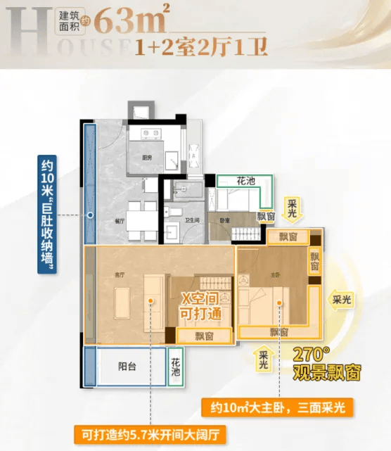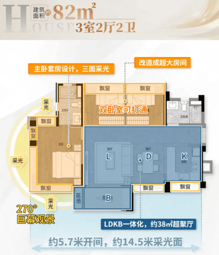 户型设计上,三开间约 9 米大采光面,让客厅、卧室都能享受充足的阳光,室内明亮通透;主卧带 U 型全景飘窗,不仅增加了使用空间,还能打造成为休闲观景的小角落;动区采用 LDKB 设计,将客厅、餐厅、厨房、阳台融为一体,空间更通透、利用率更高,朋友聚会、家庭聚餐都不会显得拥挤。