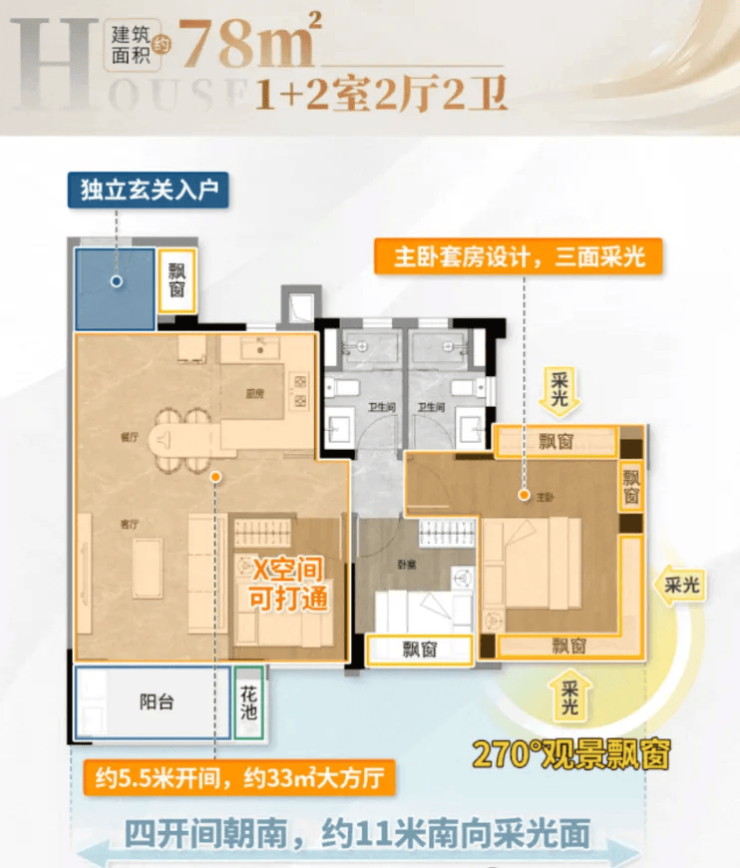 户型最大的亮点是四开间朝南,超 11 米南向采光面,让室内每个房间都能充分采光,告别阴暗潮湿;270 度采光设计,直望社区园景,推窗就能看到郁郁葱葱的绿植,居住体验极佳;主卧空间宽敞,能轻松放下 1.8 米大床,还预留了衣柜位置,收纳空间充足;双卫生间设计,避免了家人早上洗漱排队的尴尬,提升了生活效率和私密性。