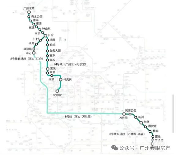 交通,是撬动区域价值的首要杠杆。【中铁诺德阅泷】于此占据决定性优势。项目楼下即是建设中的广州地铁8号线北延段(及规划支线)江府站。8号线作为贯穿广州中心城区东西的“换乘之王”,未来从此出发,可高效直达荔湾、海珠、天河等核心区。根据规划,从江府站出发,数站即可便捷换乘接入全市地铁网络,通勤效率将发生质的飞跃。同时,规划中的地铁24号线也将于此交汇,进一步巩固其轨道交通枢纽地位。