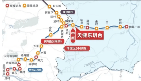 交通便捷性是《天健东玥台》的核心竞争力之一。项目距离地铁 21 号线中新地铁站直线约 800 米,步行 10 分钟内即可抵达,从中新站乘坐地铁快线,3 站就能直达天河员村站,换乘 5 号线可快速抵达珠江新城,早高峰通勤效率极高,完全能满足在天河、科学城上班的刚需群体需求。