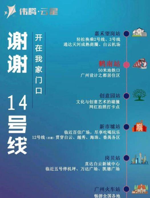 伟腾云星交通极为便利,三条地铁线路交汇于此。地铁 2 号线黄边站与项目紧密相连,为地铁上盖物业;在建的 14 号线二期鹤南站距离项目仅 50 米,预计 2021 年通车,届时通过此站可快速到达嘉禾望岗 TOD 以及广州火车站;此外,3 号线嘉禾望岗站也近在咫尺。通过地铁,项目 6 站可达广州火车站,耗时不到 20 分钟,换乘后前往天河、荔湾等区域也均在半小时内,轻松畅达全城。售楼处电话:4009909752。