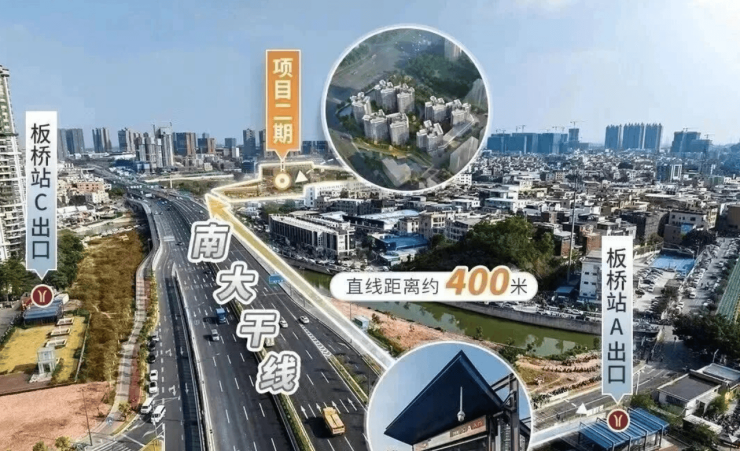 项目坐落于番禺余荫山房北侧,紧邻地铁7号线板桥站,根据项目官方实测数据,从社区步行至地铁站仅需5-8分钟,距离约500多米,真正实现“地铁口旁的家”,不用早起赶车,也不用忍受漫长的步行距离,对于上班族来说,简直是“通勤福音”。