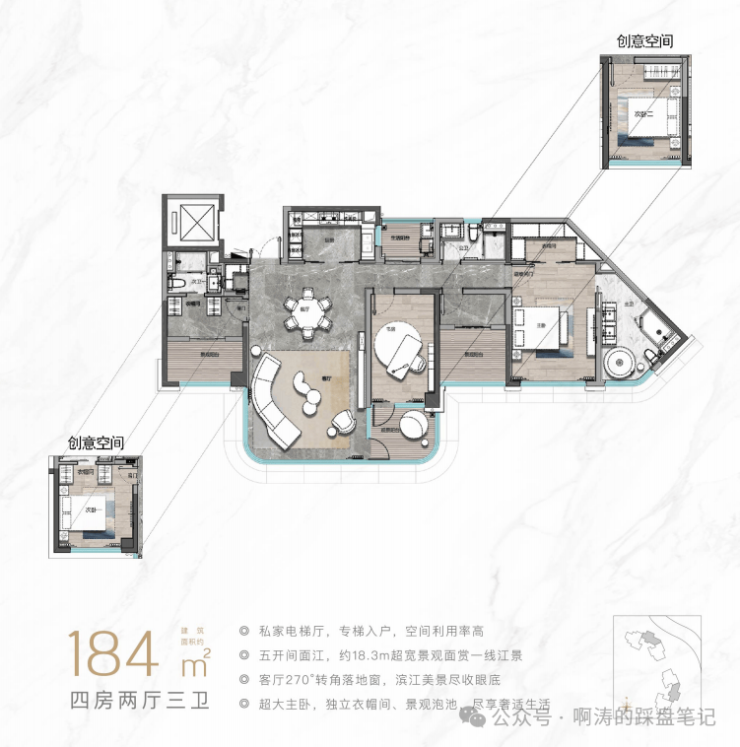 这个户型是项目的顶奢大平层产品,拥有项目顶级的空间尺度与优异的江景视野,是追求极致滨江居住体验的高端家庭的优选。