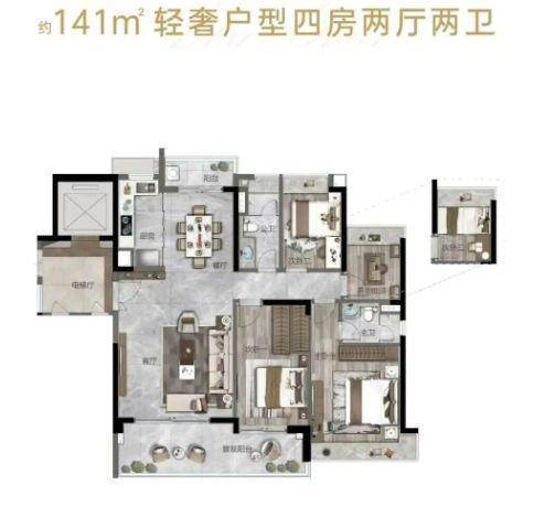 141-142㎡四房:约8.3米观景阳台,四开间朝南,主套带独立卫浴+衣帽区,适合二胎家庭。