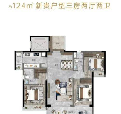 124-125㎡四房:南北通透,双阳台(生活+景观),主卧带L形飘窗,得房率约80%,LDK一体化设计,空间感强。