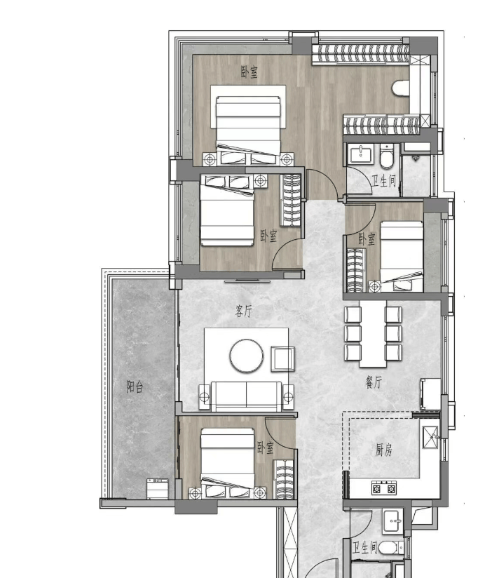 空间布局:四房两卫,主卧套房设计(独立卫浴 + 衣帽间),客厅连接约 6 米宽景阳台,通风采光极佳,独立家政间解决收纳、家务痛点,适配三代同堂、二孩家庭;