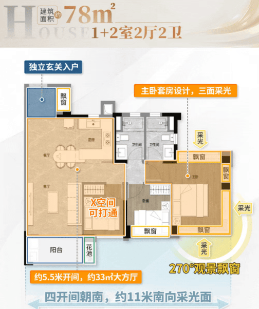 77平方米三房两厅两卫:四开间朝南,拥有超过11米的南向采光面,主卧宽敞明亮,适合追求居住品质的小家庭。
