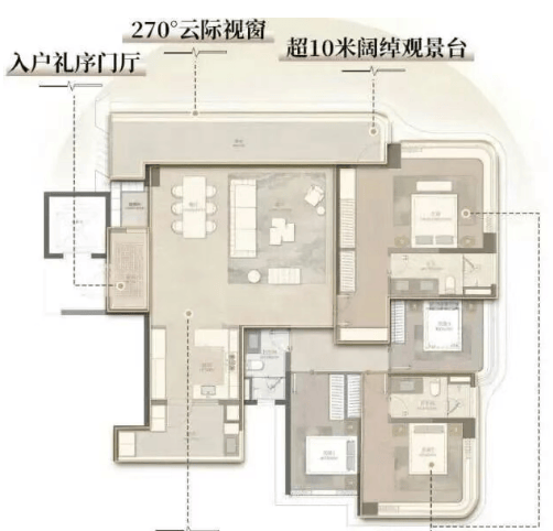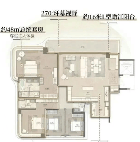 誉江户型:建筑面积约219平方米,四室两厅三卫。使用率超过102%,LDKB洄游方厅设计,客餐厨环形动线,透过11.5米超阔大开间,将江景引入室内。约16米L型阳台,270°环幕观江,前排约300米无遮挡,尽显奢居风范。