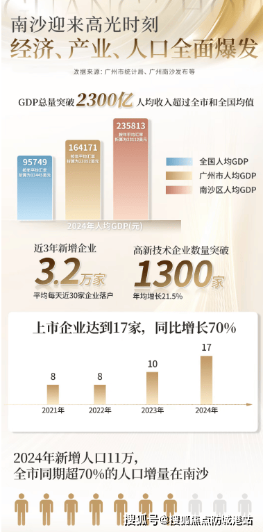 在粤港澳大湾区的几何中心,南沙早已不是昔日的滩涂之地,而是肩负国家级新区、自贸试验区、粤港澳合作示范区等多重战略使命的湾区热土。这里有着 90 项省级行政职权下放的制度红利,“双 15%” 税收优惠的独特优势,更有广州期货交易所、跨境理财通等金融开放平台加持,成为政策试验田、产业孵化器和资本收割机的代名词。2023 年 GDP 增速全市第一,全年突破 2300 亿,3 年新增企业约 3.2 万家,高新技术企业超 1300 家,近一年实有人口增加超 11 万人,占全市 7 成,种种数据都印证着这片区域的蓬勃生机。