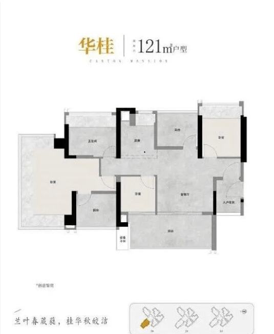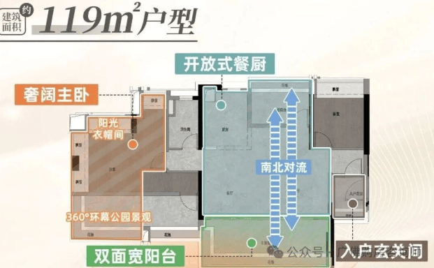 建面121平四房:独立入户空间,五开间朝南,南北对流,主卧带步入式衣柜,360°公园景观。