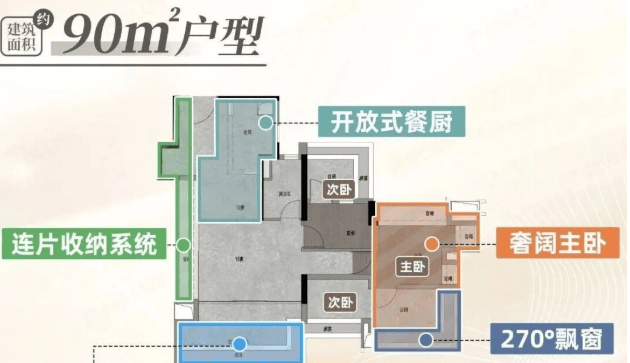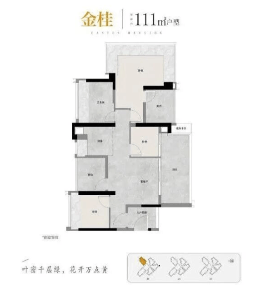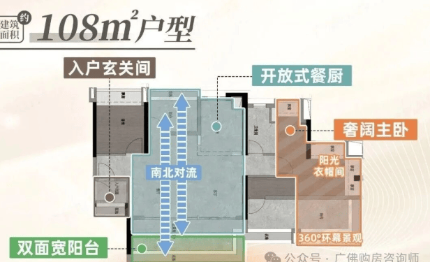 建面111平四房:带入户玄关,五开间朝南设计,南北对流,主卧带衣帽间。