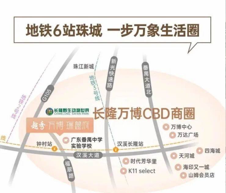 越秀·万博瑞麓府位于番禺长隆-万博核心板块,北临长隆主题乐园,交通便捷。最近地铁为7号线钟村站,步行约15分钟可达,沿途道路改造中,但整体通勤仍便捷。地铁2站可到万博核心区,3站直达广州南站,6站抵珠江新城。