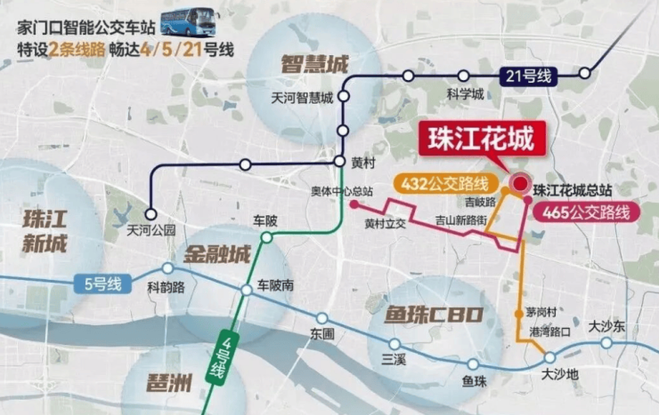 尽管珠江花城在交通上存在一些不足,但其地理位置仍具有一定的优势。小区设有公交车总站,并开通了多条公交线路,方便居民出行至地铁站和其他重要区域。例如,465路公交无缝接驳地铁4号线和21号线黄村站,432路则直达地铁5号线大沙地站。此外,项目周边还有规划中的地铁19号线和7号线姬堂站,预计将进一步提升区域的交通便利性。