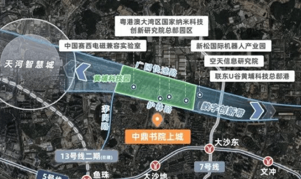 中鼎书院上城所在的大沙地板块,是老黄埔发展最早、配套最成熟的生活核心区。这里不仅是传统意义上的居住高地,更是广州“第二CBD”战略的重要承载地。项目与体量高达200万㎡的数字科技产业园仅一路之隔,周边已集聚11个重点产业园区,涵盖人工智能、工业互联网、区块链、智能装备、金融云等前沿领域。中科院空天信息研究院、纳米科技研究院、广州国际机器人产业园等国家级科研机构相继落地,未来将吸引大量高精尖人才汇聚于此,为区域注入持续活力与高端消费力。