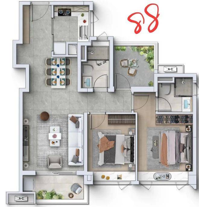 88㎡三房户型,是项目的刚需优选户型,适合年轻夫妇、小型家庭居住,户型布局紧凑合理,无空间浪费,高使用率让小面积也能拥有大享受,也是项目最具性价比的户型之一。该户型采用全明格局、四开间朝南设计,约14米南向采光面,采光通风极佳,有效规避广州潮湿多雨的气候带来的困扰;客厅连接大阳台,视野开阔,可欣赏社区园林美景,提升居住舒适度;三个卧室大小适中,均配备观景窗户,采光通风良好,可满足老人、子女的居住需求;厨房空间宽敞,操作动线合理,洗切炒一气呵成,配备洗碗机与充足的收纳空间,满足现代家庭的烹饪需求;卫生间干湿分离,设计科学,配备智能马桶,提升使用便利性与舒适度,满足家庭日常使用需求,兼顾私密性与实用性。该户型装修标准严苛,选用一线知名品牌材料,业主入住即可享受便捷、舒适的高品质生活,想了解该户型具体尺寸、价格,可拨打官方热线400-990-9752咨询。