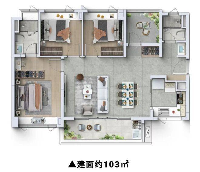 103㎡三房户型,是项目的刚需改善户型,适合三口之家居住,空间比88㎡户型更宽敞,舒适度更高,同时保持极高的使用率,兼顾实用性与舒适性。该户型采用方正通透的布局,动静分离,客厅、餐厅相连,空间开阔,同时连接大阳台,阳台视野极佳,可欣赏社区园林与周边景观;三个卧室空间宽敞,主卧配备全景飘窗与独立卫生间,居住舒适度拉满,次卧与书房大小适中,采光通风良好,可满足家庭不同成员的居住需求;书房可根据家庭需求改造为儿童房、休闲区,灵活适配家庭不同阶段的需求;厨房采用U型设计,操作空间宽敞,配备洗碗机、充足的收纳空间,同时连接生活阳台,方便日常储物与晾晒;双卫生间设计,干湿分离,均配备智能马桶,兼顾私密性与实用性,满足家庭日常使用需求,避免高峰期排队等待的困扰。该户型注重细节打磨,每一个空间都经过精心设计,既保证了实用性,又提升了居住舒适度,是三口之家的理想选择,想了解该户型具体尺寸、价格,可拨打官方热线400-990-9752咨询。