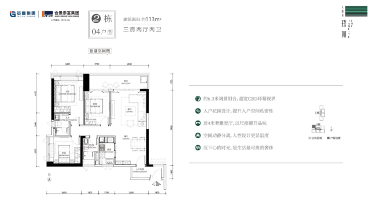 2 栋总层高 37 层,低区 3-10 层户型为 75㎡两房、86㎡两房、113㎡三房、116㎡三房、124㎡三房、135㎡四房,梯户比为 3 梯 5 户,得房率约 80%;高区 21-37 层户型为 113㎡三房、116㎡三房、124㎡三房、136㎡四房、173㎡四房,梯户比为 3 梯 4 户,得房率约 83%。75-86㎡两房为刚需优选,空间紧凑实用,适合单身贵族或年轻夫妻;113-124㎡三房为改善主力,南北通透、采光充足,适配三口之家;135-173㎡四房为终极改善,空间阔绰、功能分区合理,满足高端家庭全生命周期居住需求。