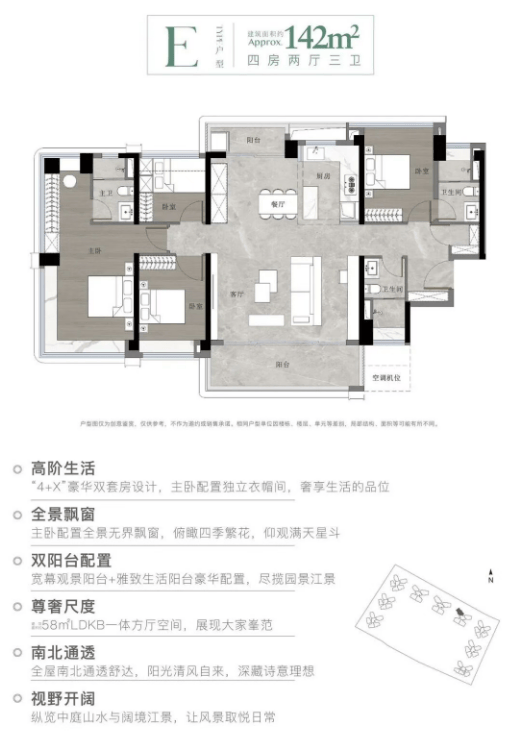 建面约142㎡双套间四房三卫:超高层楼栋,三梯四户配置,全南向优景,户户都有大阳台,主卧室享有240度窗景。
