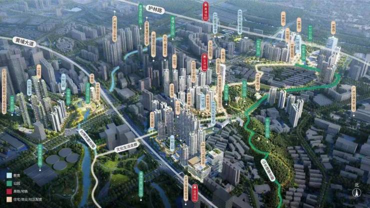 文元组团拥有双黄金地铁线,距13号线双岗地铁站约300米,步行至5号线文冲地铁站仅需500米。从这里出发,只需3站即可到达金融城,6站抵达琶洲,9站直达珠江新城,通勤十分方便。此外,项目临近多条城市主干道,如黄埔大道、临江大道、中山大道等,便于自驾出行。规划中的黄埔高铁站也将进一步提升区域的交通枢纽地位。