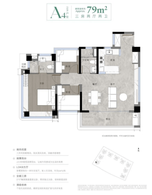 建面约79㎡三房两卫:紧凑实用的小户型,四开间朝南,采光充足。