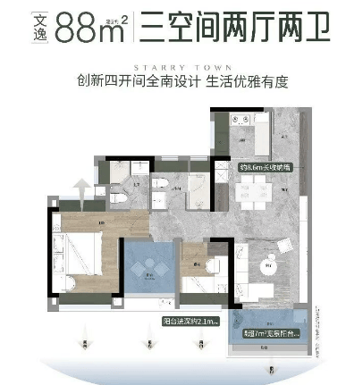 88㎡三空间两厅两卫:四面宽小户型设计,超11米景观线,朝南居家生活。