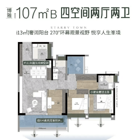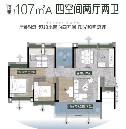 107㎡A/B四空间两厅两卫:配置南向观景玄关,仪式感入户;4.5开间朝南,客厅主卧双南北对流,畅享双面宽观景阳台。