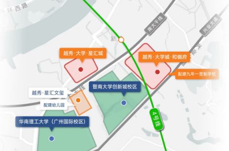越秀·大学·星汇城位于广州市番禺区,地处琶洲以南的国际创新城核心区域,紧邻地铁4号线新造站,交通便捷。这一位置不仅坐拥便捷的城市交通枢纽,还被纳入大学城二期规划版图,享有“南中国硅谷”的美誉。