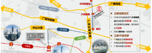城轨出行:周边有广佛东环线及穗莞深城轨两大城轨线路,进一步拓宽出行半径。广佛东环线从广州南站出发,可直接连通白云机场,板块内设有智慧城站,届时乘坐城轨可快速抵达机场、南站等交通枢纽;穗莞深城轨广州东站至深圳机场已通车,其设置的奥体中心站(天河东站,即将启用)直线距离本项目约1500米,未来往返深圳将更加高效。