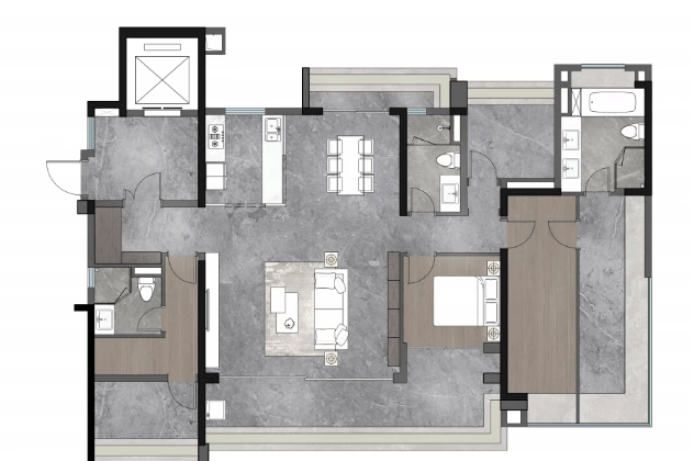 建面约143㎡全景舱平层:约44㎡LDKG大方厅设计,中西双厨配置,豪华主卧配270°转角飘窗。