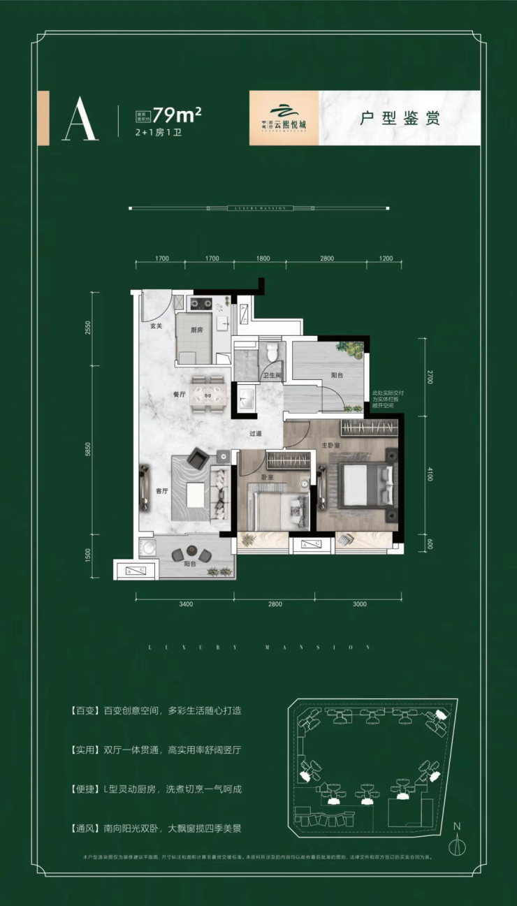 项目总占地面积约为6.05万㎡、总建筑面积约为17万㎡,绿化率为35%,容积率为2.5。共10栋1240户,2梯4户/2梯6户设计,22-26层小高层,涵盖建筑面积79-120㎡的三~四房产品。